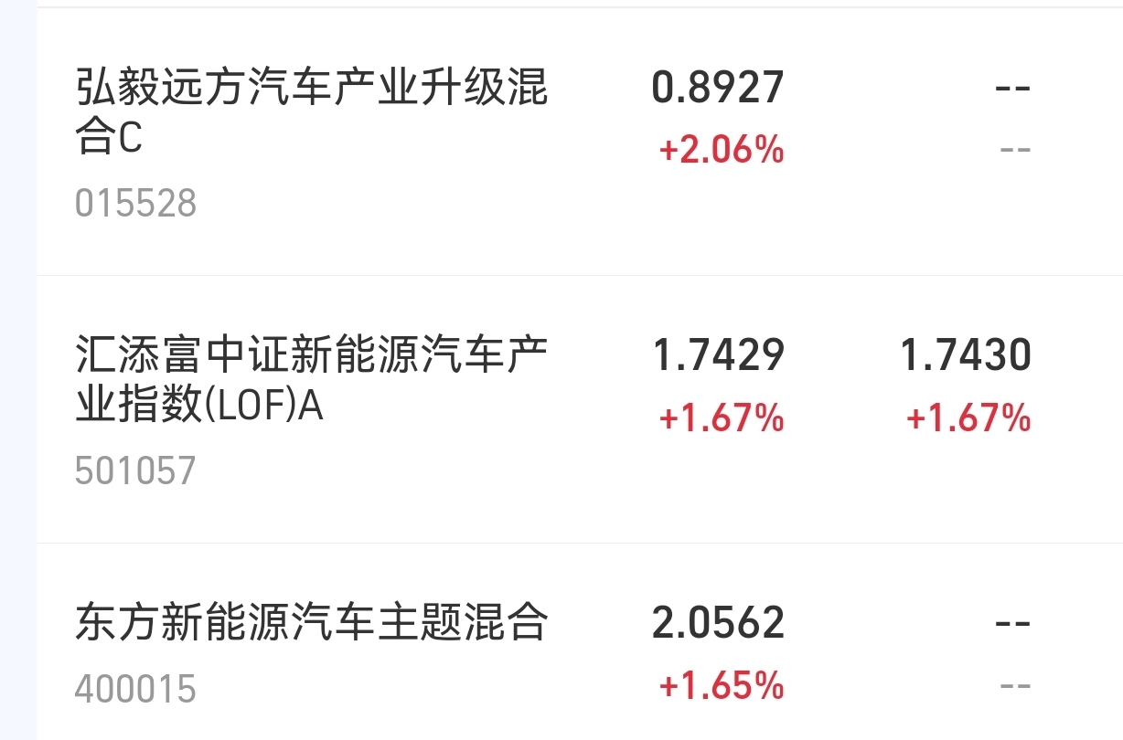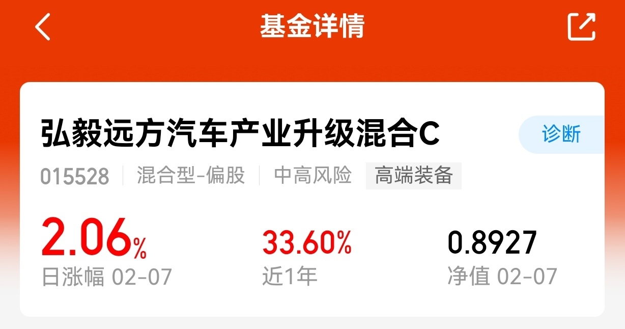 今天三大股指红丹丹的,$弘毅远方汽车产业升级混合C$ 表现实在是太强了连涨,今天上涨2.06%,近一年上涨33.6%,太强大了。感觉今年人工智能和汽车涨势拉满。