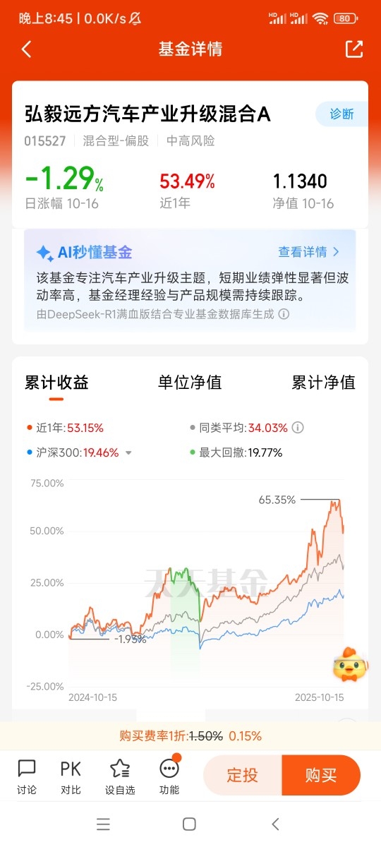 业绩表现印证策略有效性。截至2025年10月15日,基金最新净值1.1332,10月15日单日涨幅达2.87%,在算力与汽车板块联动上涨行情中展现出强劲进攻性。从波动数据看,近1个月波动率仅0.66%,在保持进攻性的同时兼顾了组合稳定性,这种“高弹性+低波动”的特征,完美适配当前市场对成长与稳健的双重需求。