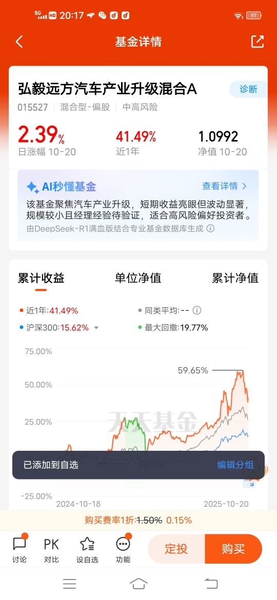 基民小虎近日准备开启定投$弘毅远方汽车产业升级混合A$,这只基金今天大涨2.39