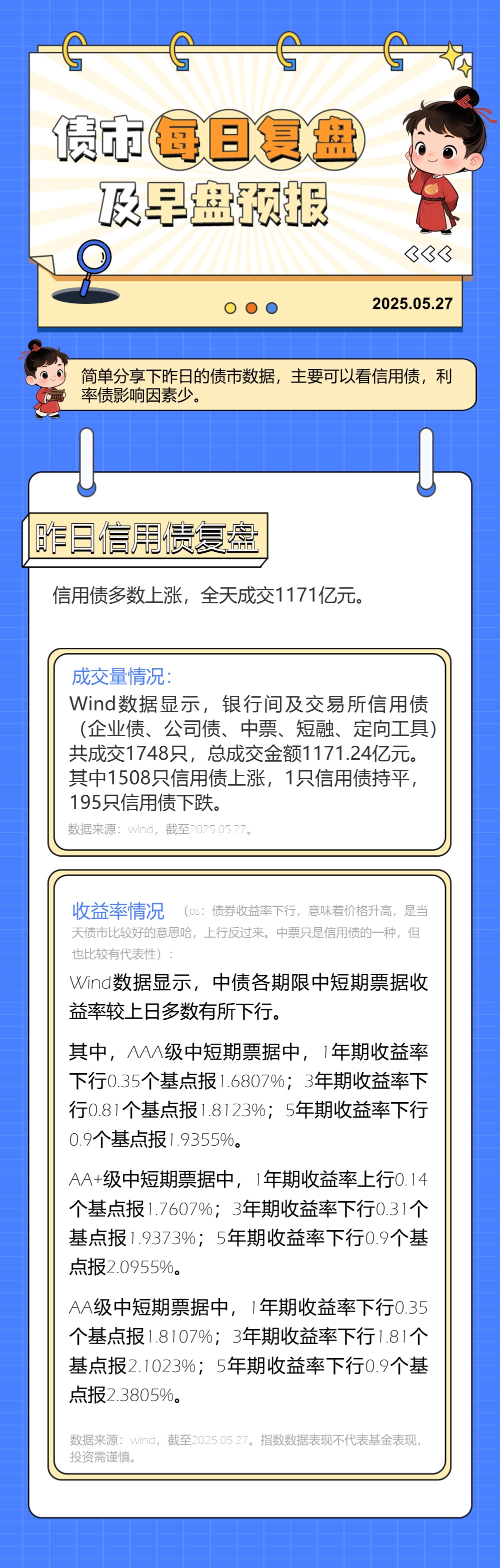 简单分享下昨天的债市数据,主要可以看信用债,利率债影响因素少。昨日信用债多数上涨,全天成交1171亿元。今天目前国债期货雨天,可转债多云,二级市场看,利率债多云,同业存单阴天,信用债多云偏晴。今天整体债市盘面多云。