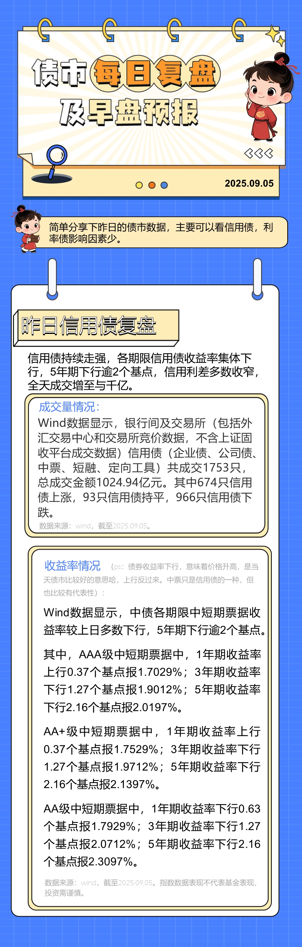 简单分享下昨日的债市数据,主要可以看信用债,利率债影响因素少。昨日信用债持续走强,各期限信用债收益率集体下行,5年期下行逾2个基点,信用利差多数收窄全天成交增至与千亿。今天目前国债期货雨天,可转债晴天,二级市场看,利率债雨天,同业存单多云,信用债多云。今天整体债市盘面多云。