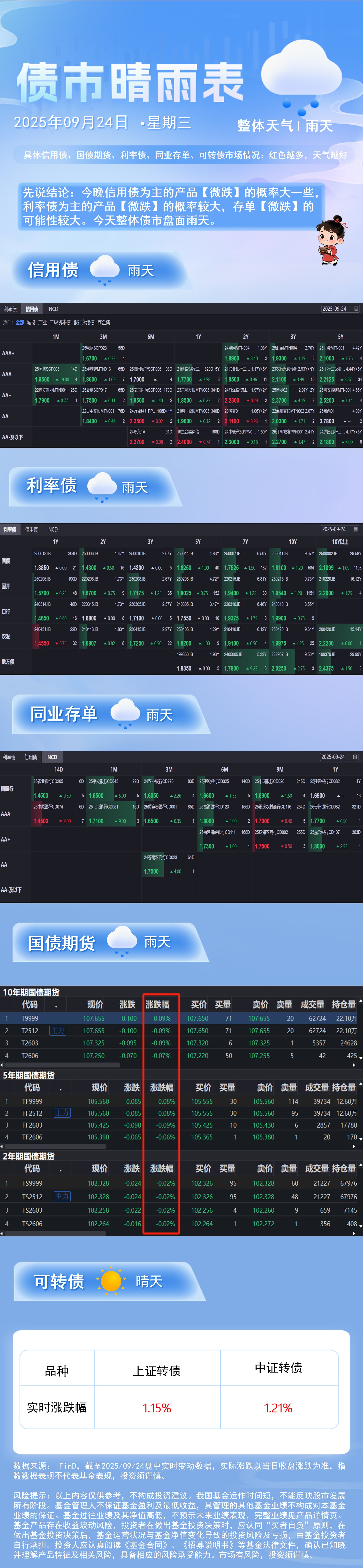 先说结论:今晚信用债为主的产品【微跌】的概率大一些利率债为主的产品【微跌】的概率较大,存单【微跌】的可能性较大。今天整体债市盘面雨天。