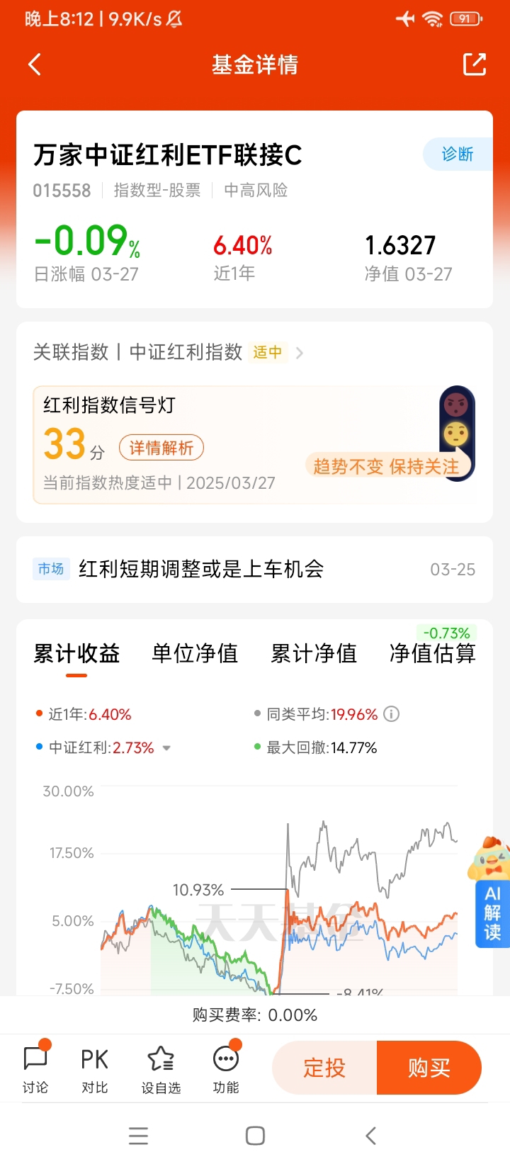 $万家中证红利ETF联接C$ (015558)作为一只跟踪中证红利指数的ETF联接基金,在当前市场环境下展现出一定的投资价值。该基金主要投资于高股息、分红稳定的股票,适合追求稳健收益的投资者。以下是其投资价值的几点分析: