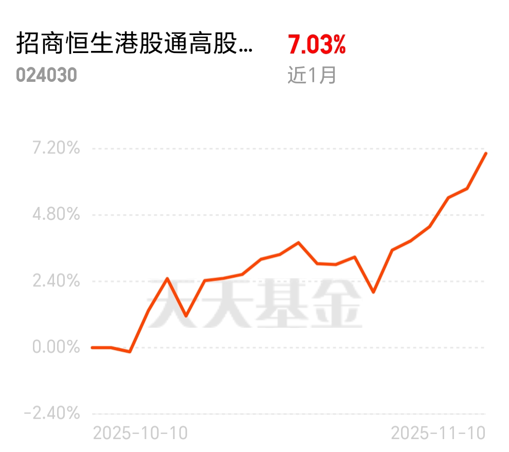 港股红利低波指数的年化波动率更低,抗风险能力强,招商恒生港股通高股息低波动ETF联接C昨日涨幅1.20%,表现稳健又给力,近1个月累计涨7.03%,长期持有更安心。