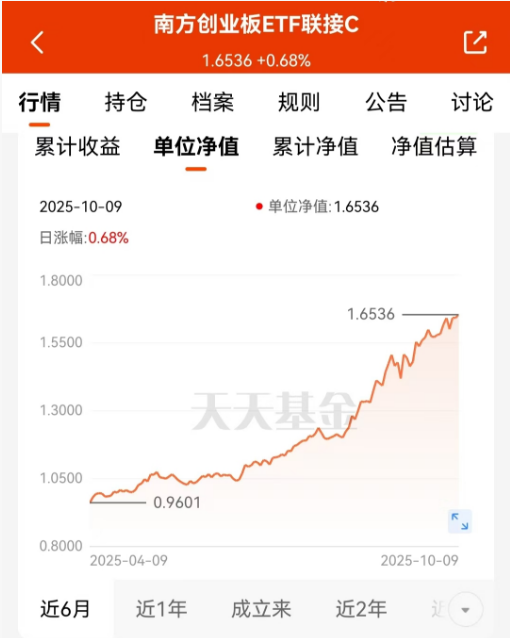最后再说说我的这个$南方创业板ETF联接C$(004343)。经过这段时间的持有,我觉得它确实是个不错的投资工具。特别是在创业板表现好的时候,它的弹性充分显现出来,近一月涨了13%,今年以来涨了50%。这基金的运作模式决定了它必须紧密跟踪创业板指数,所以当指数上涨时,它一般不会掉队。费率低这个优点在长期投资中会不断放大其优势。在当前市场环境下,创业板的成长特性受到关注,通过这基金这样的基金来把握机会,我觉得是个相对稳妥和省心的选择。#指数操盘手集结令#