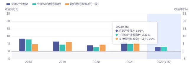 从全年看,截至11月22日,在混合债券型基金(一级)平均涨幅归零的情况下,招商产业债A年内涨幅3.08%。