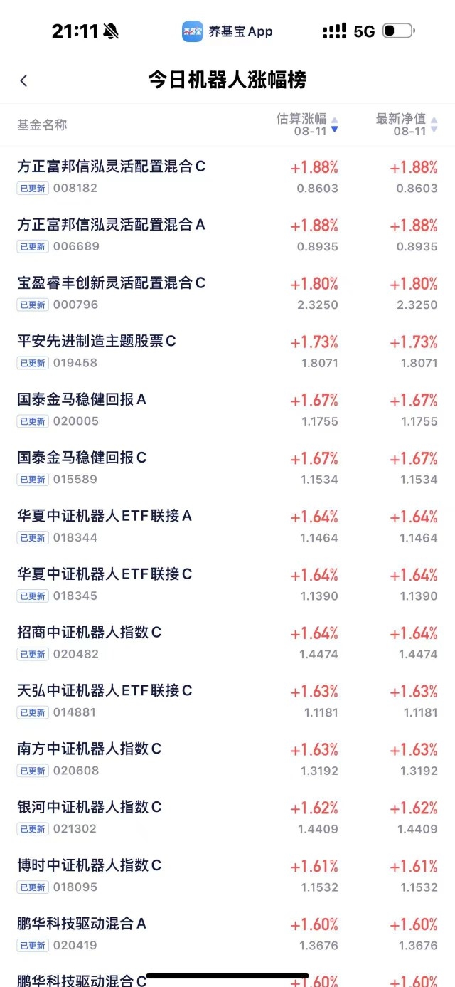 机器人板块重拾升势,PEEK材料大涨显示需求回暖。政策引导明确,技术迭代加速,特斯拉人形机器人带来长期想象。方正富邦信泓A今日上涨1.88%,专注成长领域,布局得当。$国泰金马稳健混合C$ 今天净值上涨1.67%也不错,一起加油#八月基金投资策略#