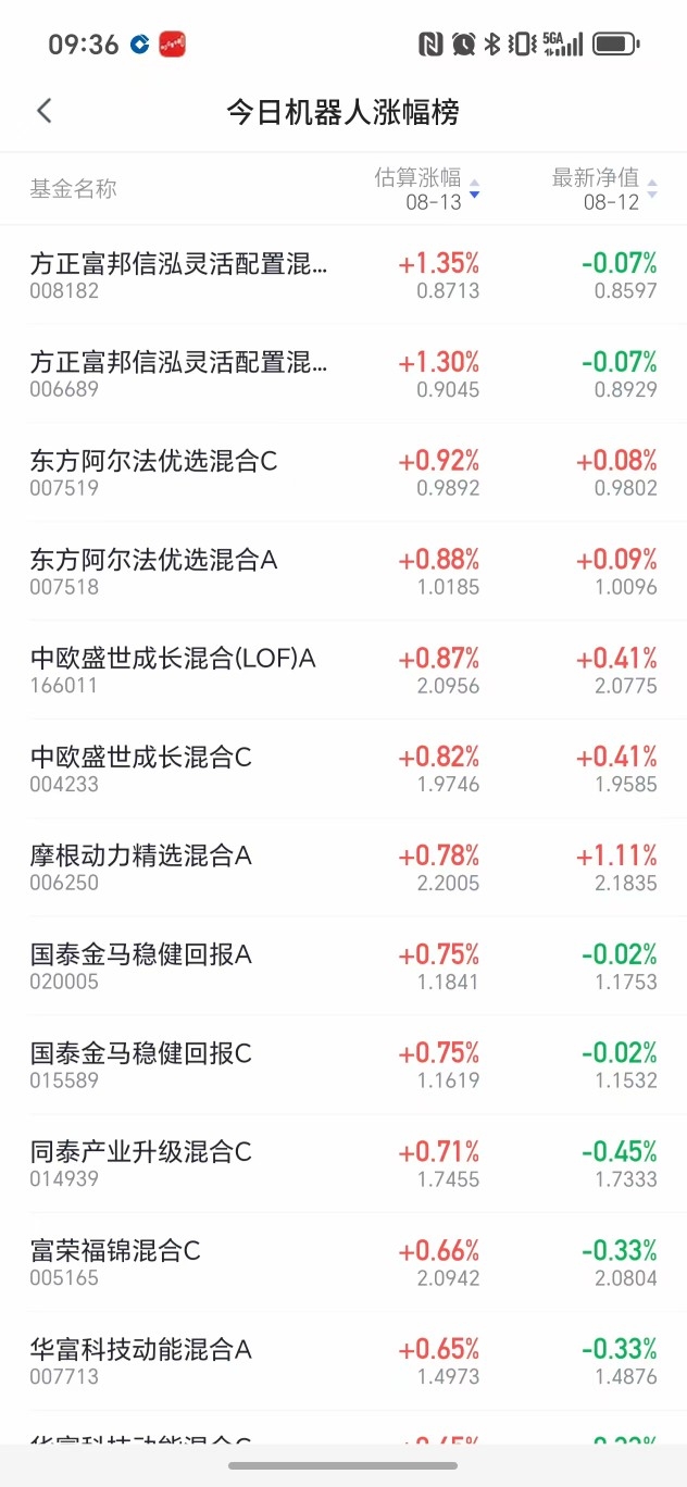 最近机器人行业真是风生水起,政策支持明确,企业订单不断,连终端用户都在主动采购。今天方正信泓又涨了,而且是领涨,说明它抓住了这波机会。这产品风格稳健,不搞激进操作,基金经理专注基本面研究,选的公司都有真本事,长期持有体验不错。方正富邦信泓C目前估值上涨1.35%真不错了$国泰金马稳健混合C$ 当前估值上涨0.75%也还行,继续努力#八月基金投资策略#