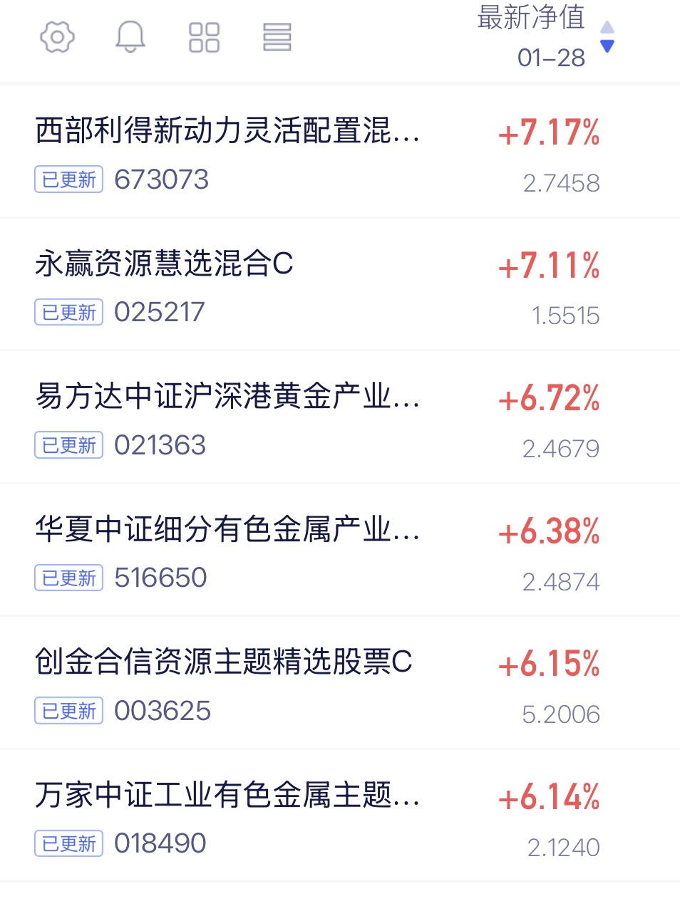 $西部利得新动力混合C$ 今天上涨7.17%,这个够猛的,周期轮动策略,今年以来重仓黄金,锐度高,业绩太顶了,近一个月46.83%。