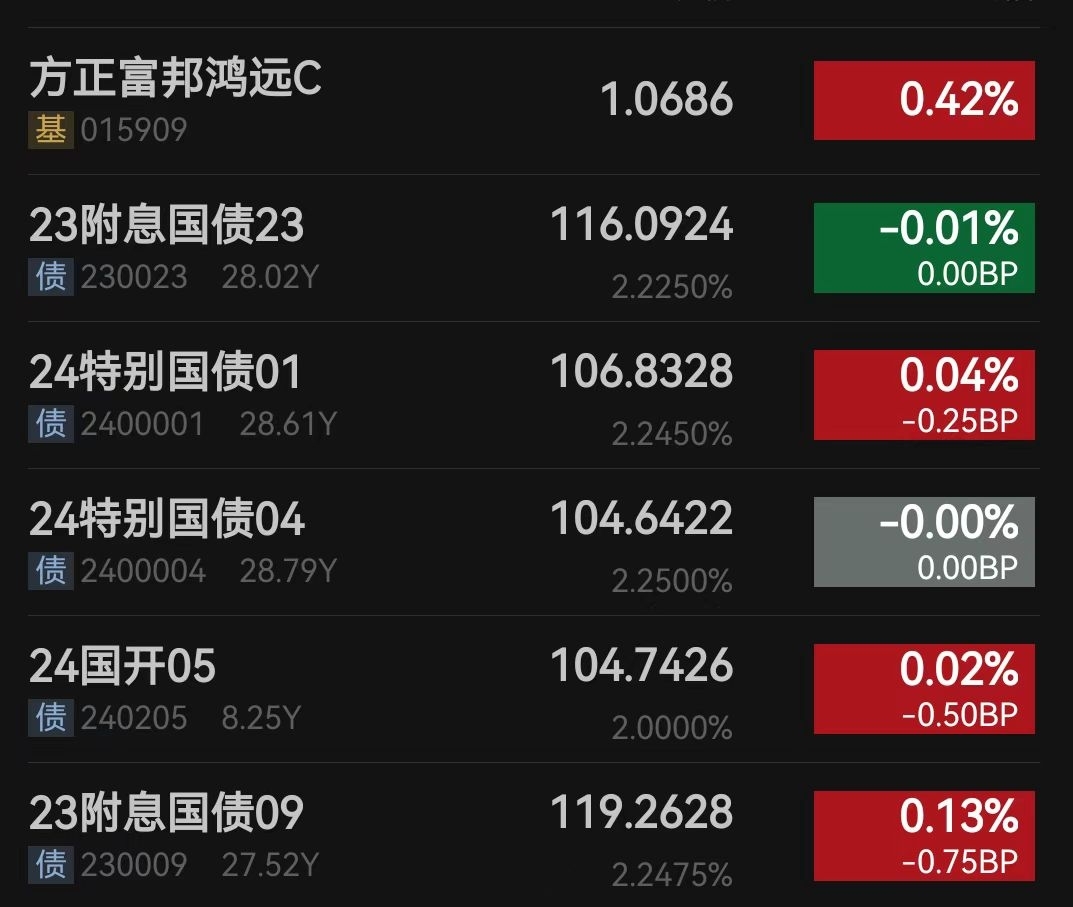 股债双收,今天是丰收的一天,今天都吃肉!从盘面上看长久期利率债领涨,10年红1.1BP,超长红0.8个BP,超长利率债继续吃肉了,信用债整体晴天,整体3-4个蛋。产品收蛋情况:$方正富邦鸿远债券C$ 20-25蛋,久期比较高,今天债市回暖应该也不会让我失望。 永赢的话:预估14-17蛋,弹性没有方正好。7-10年:7-10蛋; 0-5年:2-4蛋,短端还是受制久期,再涨回暖的话也跑不赢长端利率债,有点可惜。平安的话今天大概率收10个蛋以上。我觉得经过之前调整加上资金面宽松延续下回暖行情可期啊!