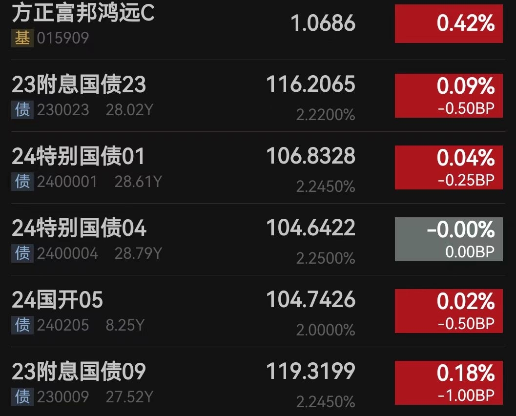十月看来又是吃肉啊,今天美滋滋的股债双收!我看估值太给力了,今天稳稳的幸福了。从盘面上看长久期利率债领涨,10年红1.2BP,超长红1.2个BP,超长利率债继续吃肉了,信用债整体晴天,加上票息也很香,整体3-6个蛋。产品收蛋情况$方正富邦鸿远债券C$ 预估20-25蛋,久期比较高,今天希望也有大蛋。 永赢的话:预估13-17蛋,弹性没有方正好,最近比不过方正。7-10年:7-13蛋; 0-5年:2-5蛋,短端还是受制久期,再涨回暖的话也跑不赢长端利率债,有点可惜。平安的话今天可能是收10个蛋以上,当然如果买的红利股的话就比较难了。我觉得经过之前调整加上资金面宽松延续下回暖行情可期啊!