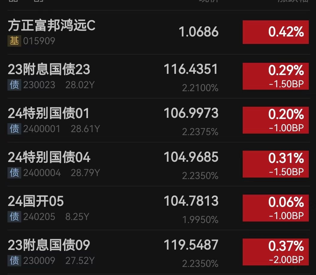 十月真好啊,美滋滋的股债双收!今天稳稳的幸福了。从盘面上看长久期利率债领涨,10年红1.2BP,超长红2个BP,超长利率债继续吃肉了,信用债整体晴天,加上票息也很香,整体3-6个蛋。产品收蛋情况: $方正富邦鸿远债券C$ 预估40-42蛋,久期比较高,今天妥妥的大蛋。 永赢的话:预估20-23蛋,弹性没有方正好,最近比不过方正。7-10年:7-13蛋; 0-5年:2-5蛋,短端还是受制久期,再涨回暖的话也跑不赢长端利率债,有点可惜。平安的话今天可能是收10个蛋以上,当然如果买的红利股的话就比较难了。我觉得经过之前调整加上资金面宽松延续下回暖行情可期啊!