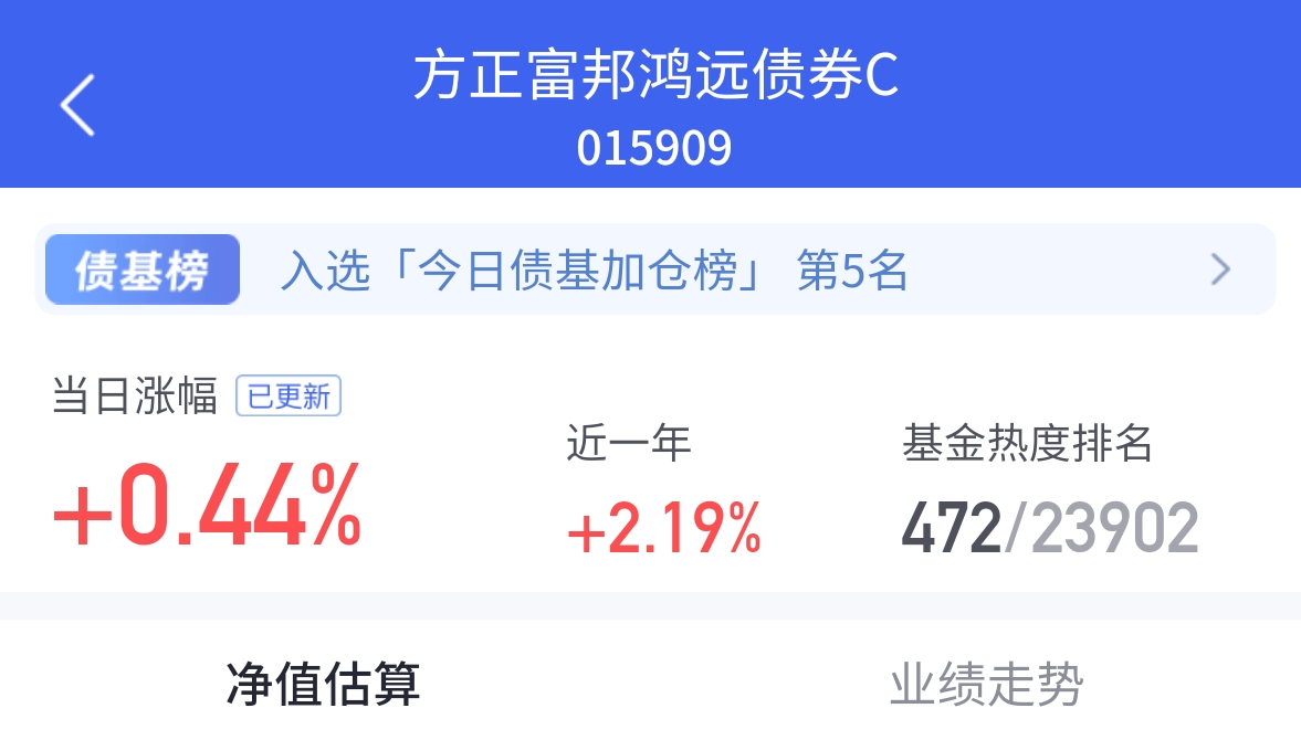 今天债市表现稳健,利率债领涨板块,资金面偏松,DR007小幅下行,利好仍在。$方正富邦鸿远债券C$ 收下44个蛋,反弹过程中跟得较紧,其他基金也有收益,只是弹性和速度差了些。