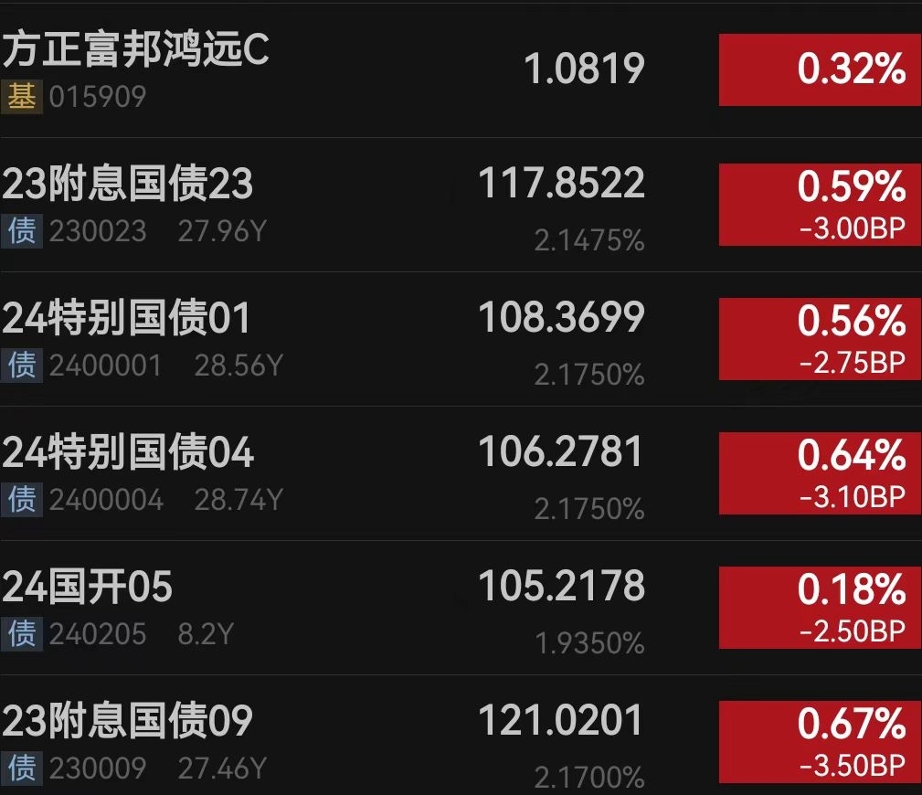 债市开盘见红啊!超长涨幅3.25bp,昨天超长收蛋真不小,希望今天继续吃大肉啦!中长期也还不错,涨幅3.55bp,昨天虽然收蛋不多但是还是很稳啦!信用债今天一片红,可以收蛋了。热门产品收蛋情况: $方正富邦鸿远债券C$ 预估78-82蛋,久期比较高,今天债市回暖应该也不会让我失望。 永赢的话:预估72-76蛋,弹性没有方正好,最近都跑输方正。7-10年:16-22蛋; 0-5年:6-10蛋,短端还是受制久期,再涨回暖的话也跑不赢长端利率债,有点可惜。目前看股市的情况的话平安今天大概率收10个蛋以上。我觉得经过之前调整加上资金面宽松延续下回暖行情可期啊!