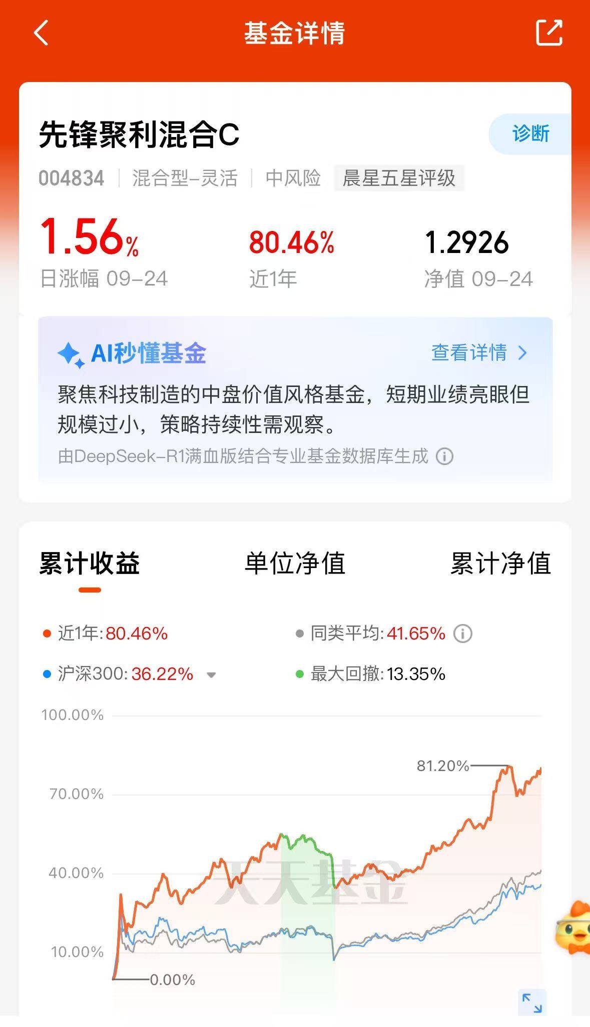 先锋聚利混合C对科技产业的前瞻真犀利,昨天1.56%果断拉升,近三个月23.53%收益,近一年80.46%超额回报,利率下行环境利好成长股