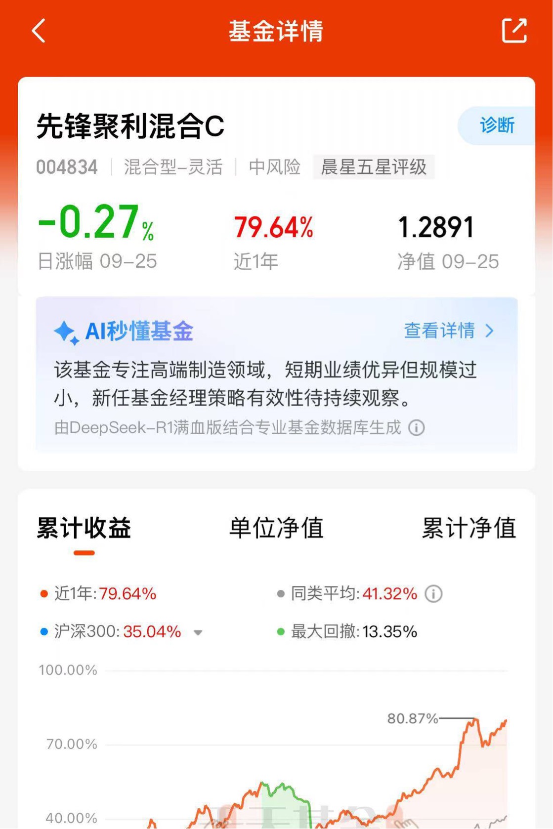 先锋聚利混合C近三个月21.52%的收益够扎实,略微回调,今天正好有上车点大涨,六个月21.36%稳步推进