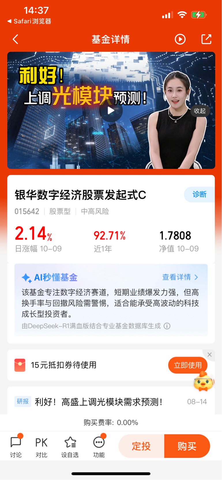 如果你最近关注基金市场,一定对“银华数字经济股票发起式C”这个名字不陌生。近一年92.71%的收益率,把沪深300指数按在地上摩擦,在数字经济赛道里简直是“尖子生”般的存在。但这只基金到底是真金不怕火炼,还是昙花一现的“网红款”?今天咱们就扒开它的“外衣”,从业绩、持仓、基金经理、风险等各个维度,来个彻彻底底的深度测评。