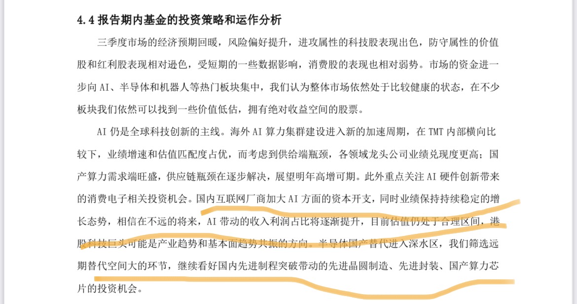 选择一只主动管理型基金,很大程度上就是选基金经理的眼光和定力。所以我个人非常看重基金定期报告里“报告期内基金投资策略和运作分析”这部分,看看基金经理是不是真的说到做到、知行合一。王晓川经理在银华数字经济股票基金的2025年三季报中就明确写道:“国内互联网厂商加大AI方面的资本开支,同时业绩保持持续稳定的增长态势,相信在不远的将来,AI带动的收入利润占比将逐渐提升,目前估值仍处于合理区间,港股科技巨头可能是产业趋势和基本面趋势共振的方向。半导体国产替代进入深水区,我们筛选远期替代空间大的环节,继续看好国内先进制程突破带动的先进晶圆制造、先进封装、国产算力芯片的投资机会。” 这种在波动中坚守核心逻辑、着眼长远的定力,正是投资AI这种高波动高成长板块所必需的。