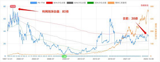 再看微软。科网泡沫顶点时估值80倍,如今涨了这么久,也不到40倍,远没有达到泡沫顶部的估值水平。所以,对美股那几家真正的AI龙头来说,估值不算便宜,但远未到崩溃的边缘。
