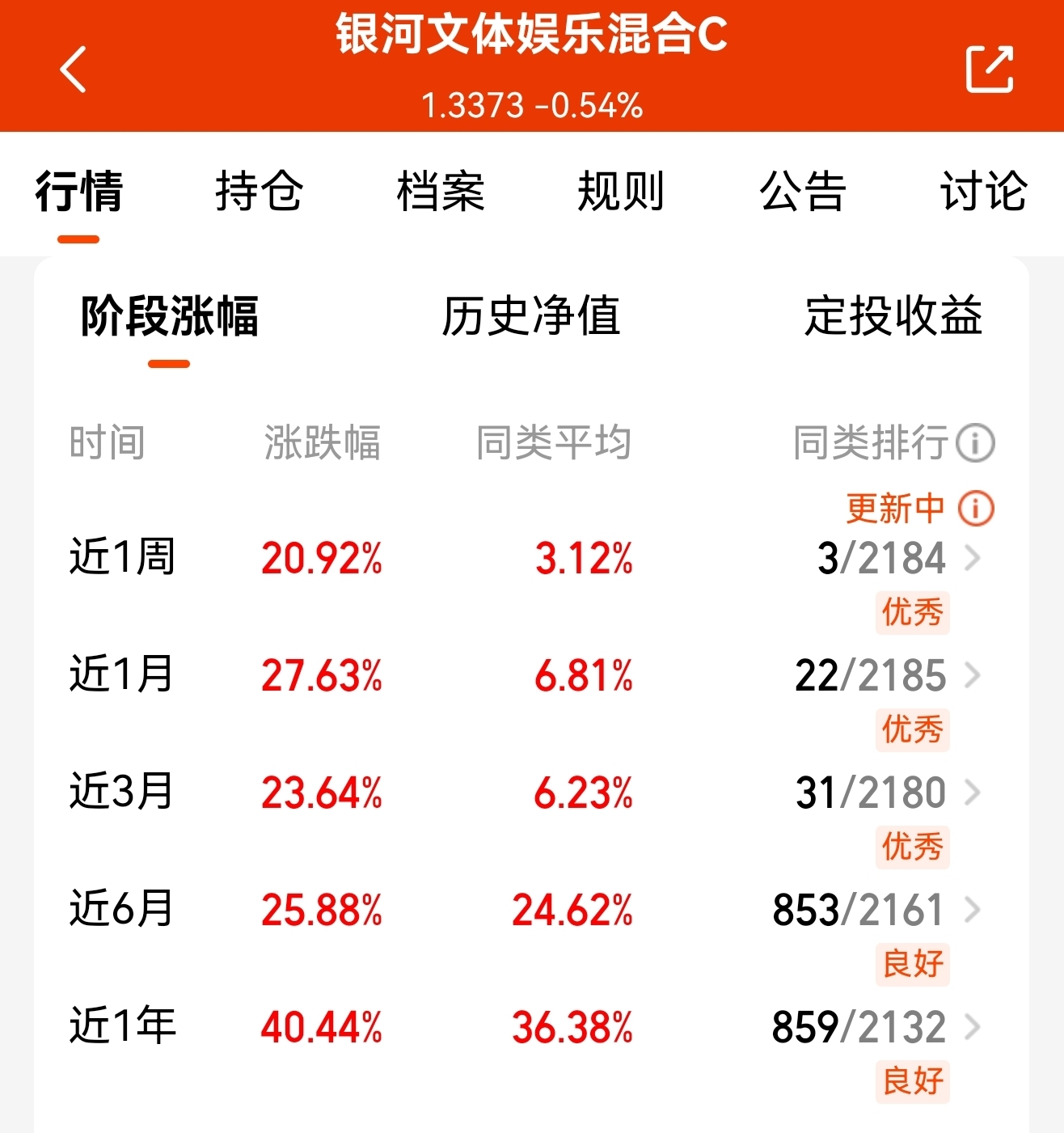 我滴妈呀,万万没想到啊,$银河文体娱乐混合C$ 今天在航空航天AI调整的时候仅仅微调了0.54%,我今天刚刚布局以为也要大调整呢,还是这么能打能抗,聚焦文体娱乐赛道,近一年收益40.44%,我要逢低布局了。