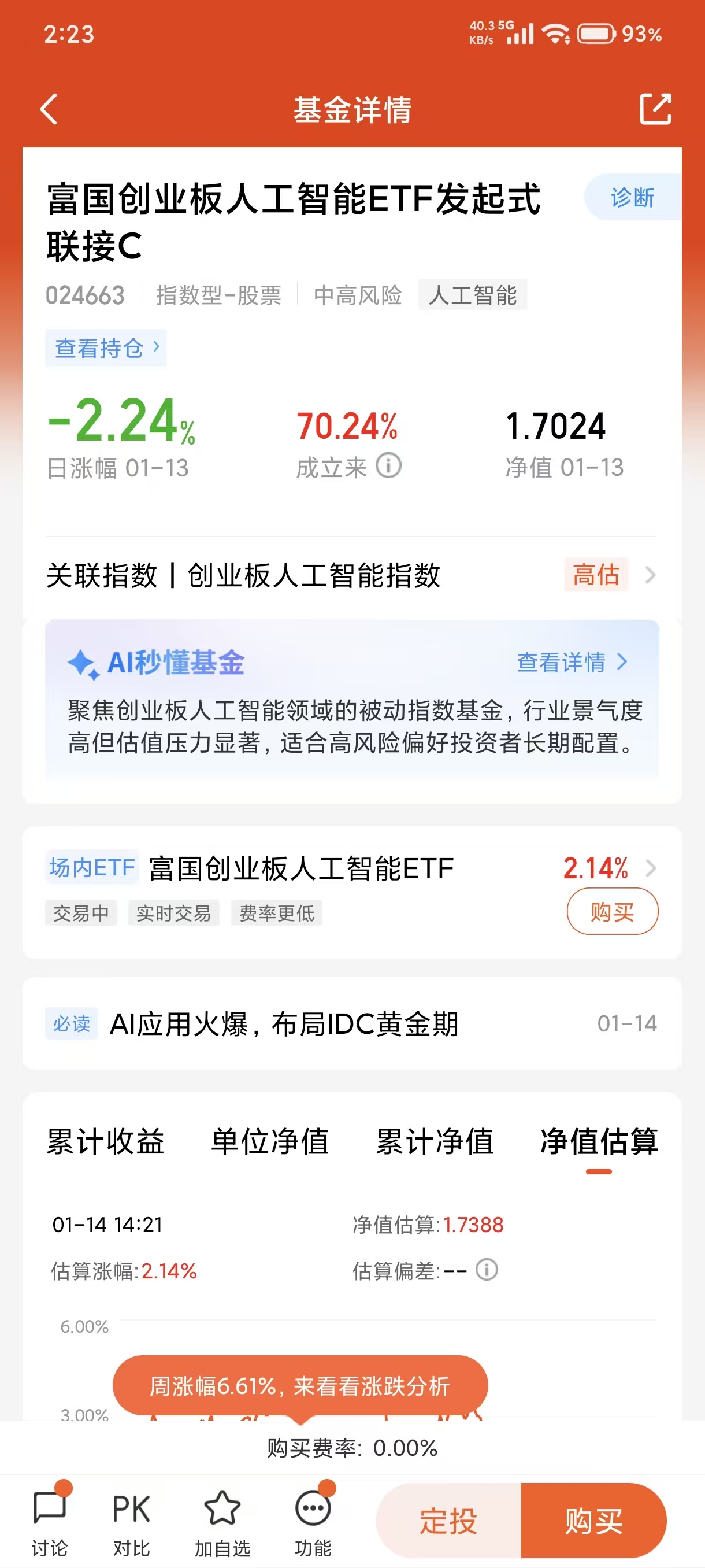 今天我选择加仓1000元富国创业板人工智能ETF发起式联接C(024663),这只基金跟踪的是创业板人工智能指数,包括创业板中与人工智能技术研发、应用密切相关的上市公司,前十大重仓股包括中际旭创、新易盛、天孚通等。$富国创业板人工智能ETF发起式联接C(OTCFUND|024663)$