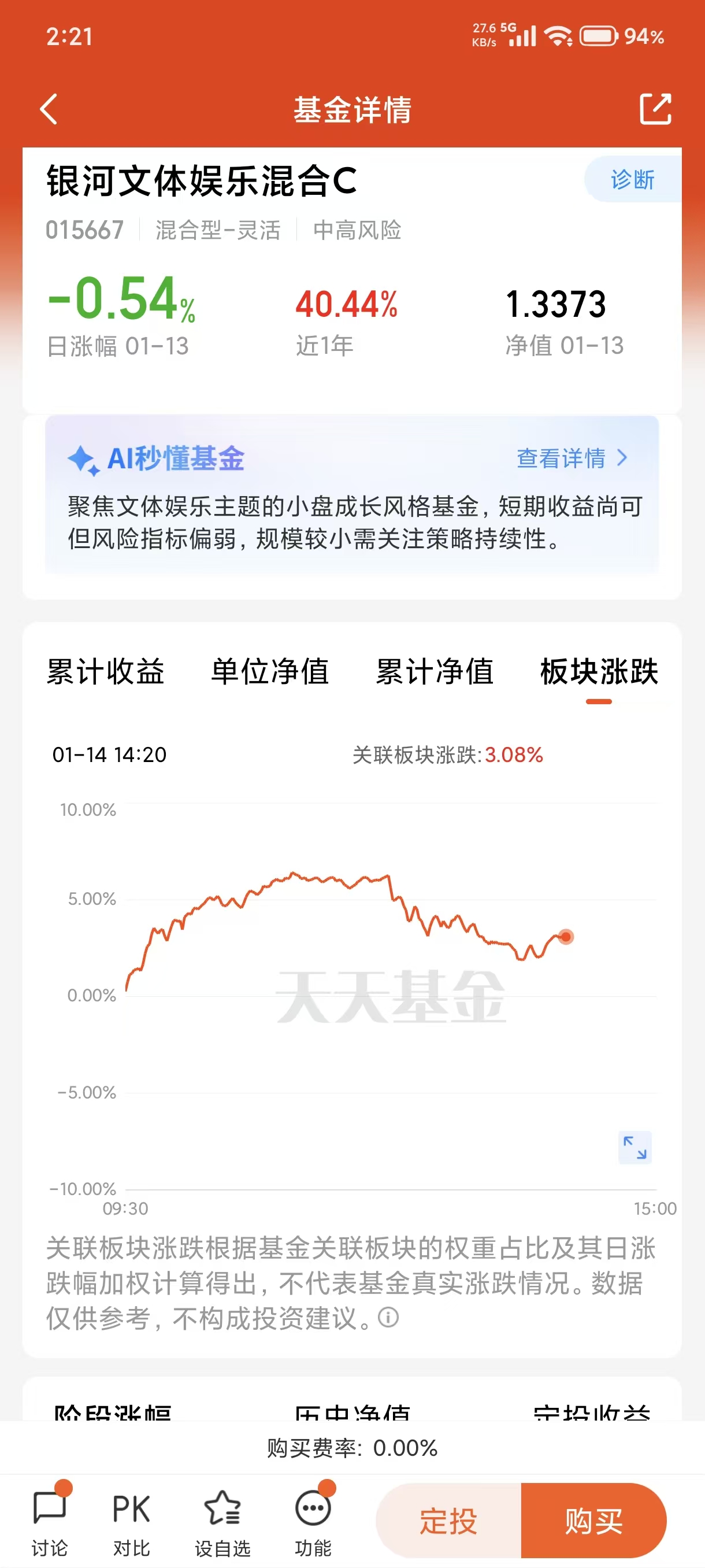 今天我选择加仓2000元银河文体娱乐主题灵活配置混合C(015667)。基金主要集中在人工智能(AI)应用、传媒、游戏、旅游等领域。前十大重仓股包括分众传媒、昆仑万维、三七互娱等。这只基金近一周涨幅20.92%,同类排名位居前列。后续我会持续加厚仓位,长期看好AI的行情以及这只基金的表现。$银河文体娱乐混合C(OTCFUND|015667)$