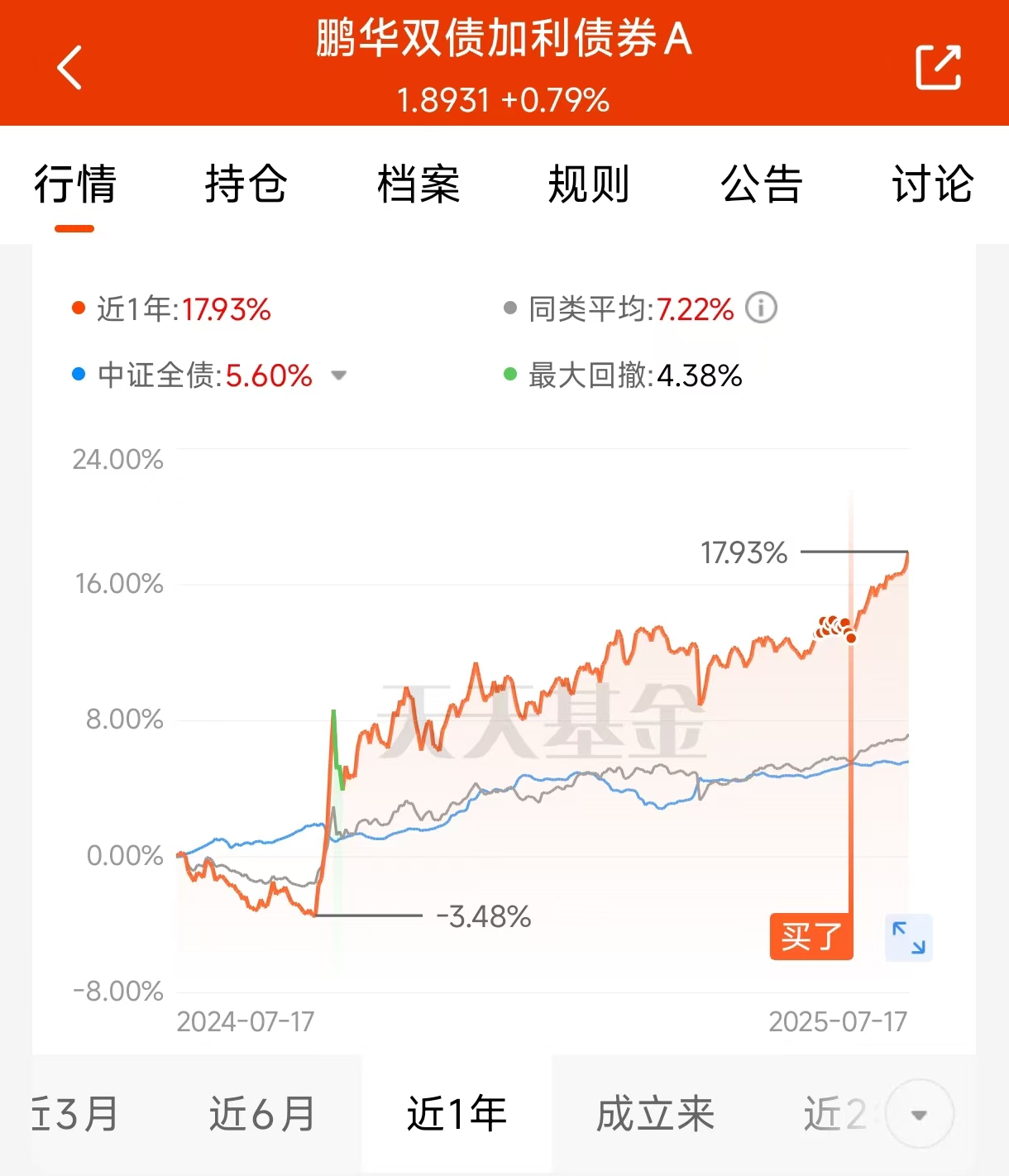 分享个真香定律:$鹏华双债加利债券D$(022226)+7天持有=行情。这基金近一年16%的收益不是吹的,行情差时跌得少,行情好时涨得快。我看过它的持仓,可转债+高收益债的搭配很聪明,股市有机会就转股吃肉,没行情就吃票息。特别适合现在这种反复磨底的市场,我已经把三分之一仓位挪过来了,手续费省下来都是赚的。#创新药赛道持续活跃 行情空间有多大?#
