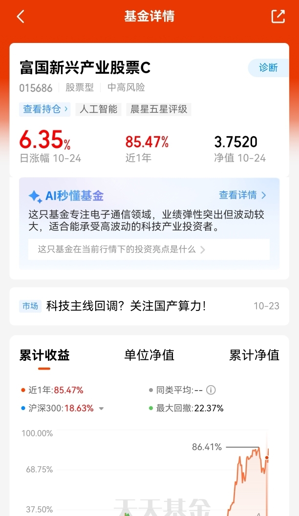 哈哈,晚上好,今天没想到市场这么强,还好前几天趁回调加了科技$富国新兴产业股票C$ 太香了,今天大涨6.35%,近一年上涨85.47%。主动基反弹力度就是比指数基金强多了,吊打同类产品和沪深300指数,超额收益直接拉满。今年美联储可能还会降息两次,大概率还有大肉吃,一定要拿住了。