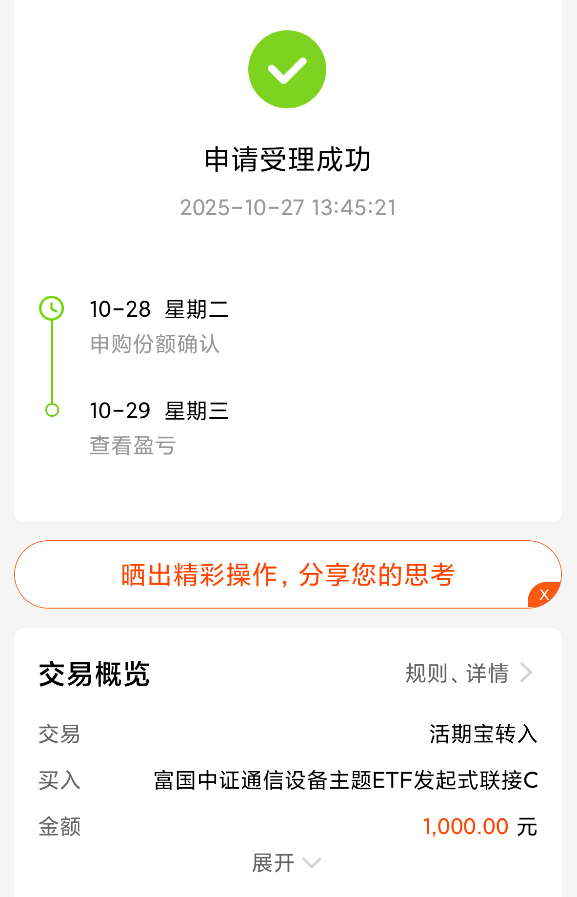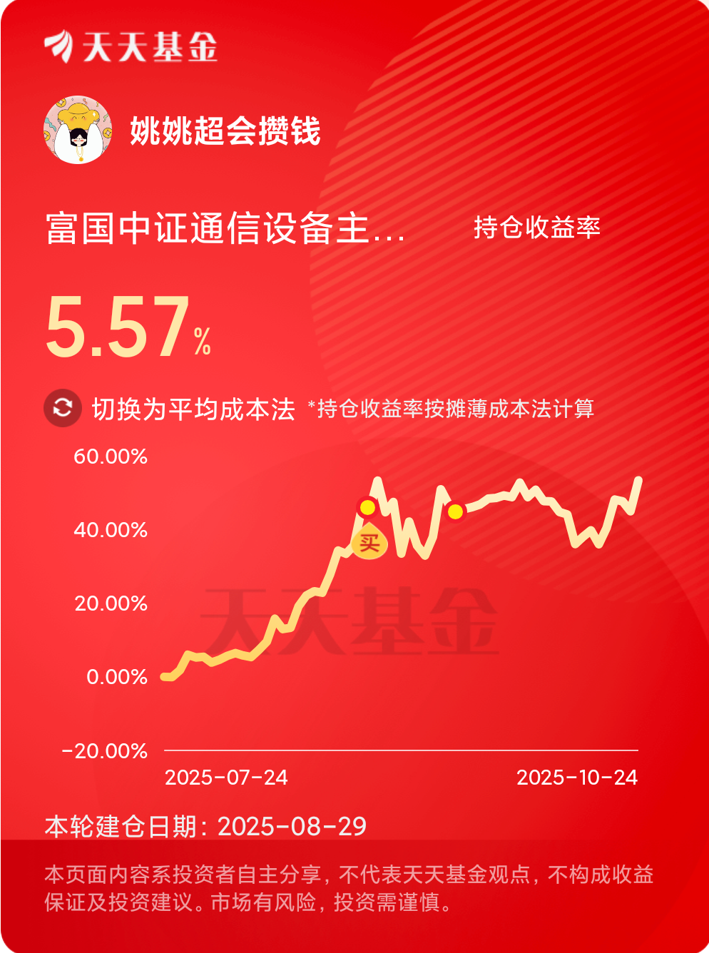 宝子们好呀,今天受到周末利好消息的影响A股直接一个高开,其实目前各个消息面都透露出要对市场有信心,只不过其中肯定很多波折,现在这种行情,最忌讳的就是来回摇摆,还是那句话要信早信!个人看来4000点是触手可及的,今天目前行情虽然有点跳水,又开始拉大块头,科技与大块头此起彼伏,但是咱通信板块还是稳定上涨3个点!说白了现在市场要靠着CPO去上冲,资金都愿意去承接,而且目前N字型走势,姚姚要趁势打个仓位1000元$富国中证通信设备主题ETF发起式联接C(OTCFUND|021934)$坐等CPO的进一步上攻了!