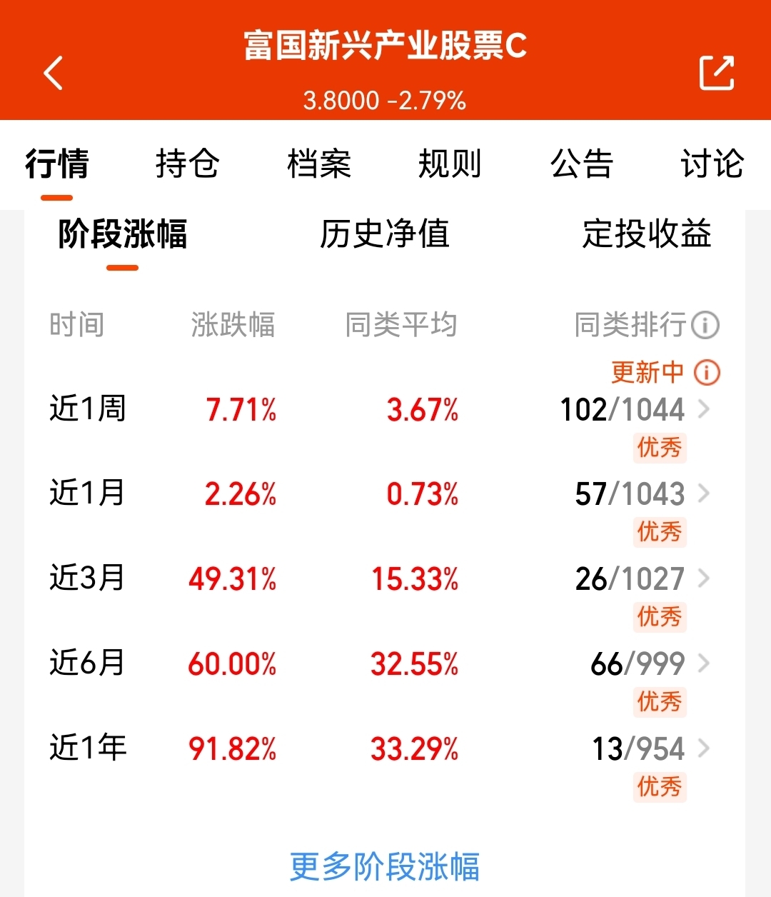 今天权益市场走低,比较涨了这么久,调整也属于正常,但目前牛市行情还在,逢低补仓,反弹时才能吃到更多的涨幅!$富国新兴产业股票C$ 近一周涨7.71%,业绩各阶段优秀!