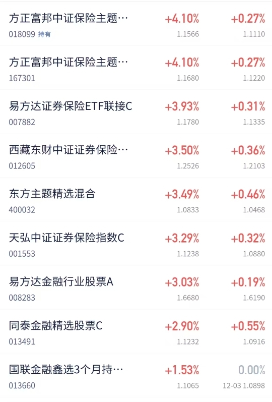 经济预期改善时,保险往往比银行反应更快。一方面投资收益随市场回升,另一方面居民保障需求也可能回暖。银行虽有股息支撑,但在行情启动初期,参与感相对较弱。$鹏华中证800证券保险指数(LOF)C$ 目前3.23%,$方正富邦中证保险A$ 上涨4.11%,$招商中证国新央企股东回报ETF发起式联接A$