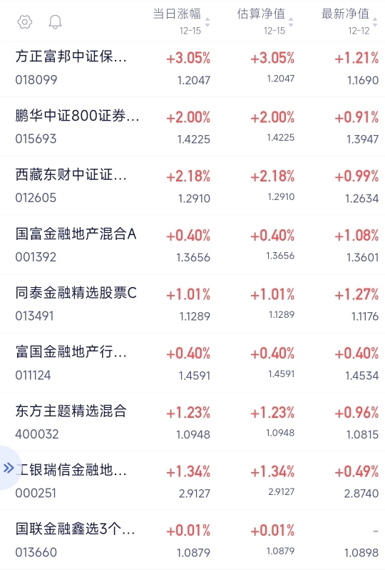 $鹏华中证800证券保险指数(LOF)C$ 上涨2%,$方正富邦中证保险A$ 上涨了3.05%,$招商中证国新央企股东回报ETF发起式联接A$ #【跨年坦白局】提问金梓才、陈果#