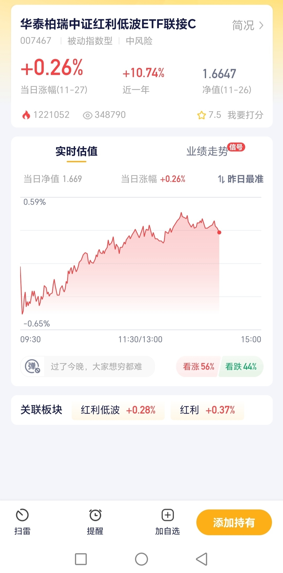昨天红利低波小跌0.54%,不过近一年涨了10.74%,这个表现放在股票型基金里算挺稳的了。华泰柏瑞就是挂钩红利低波指数的——这种指数专门挑“分红多、涨跌稳”的票,行情震荡的时候,比那些激进的基金抗跌多了。虽然现在指数说高估,但要是你想配点“防御型”的,这个产品真的合适,毕竟行情不稳的时候,稳才是王道。$华泰柏瑞中证红利低波ETF联接C$ #3800点的A股值得加仓吗?#
