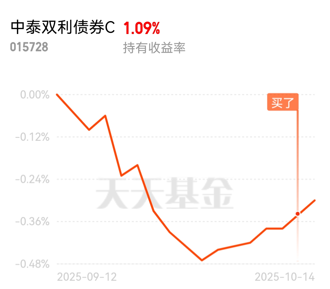 银行板块涨了不错,含银行股的低波固收+中泰双利债券C产蛋5个,过去7个交易日里面6天上涨,1天持平,近期表现还不错!