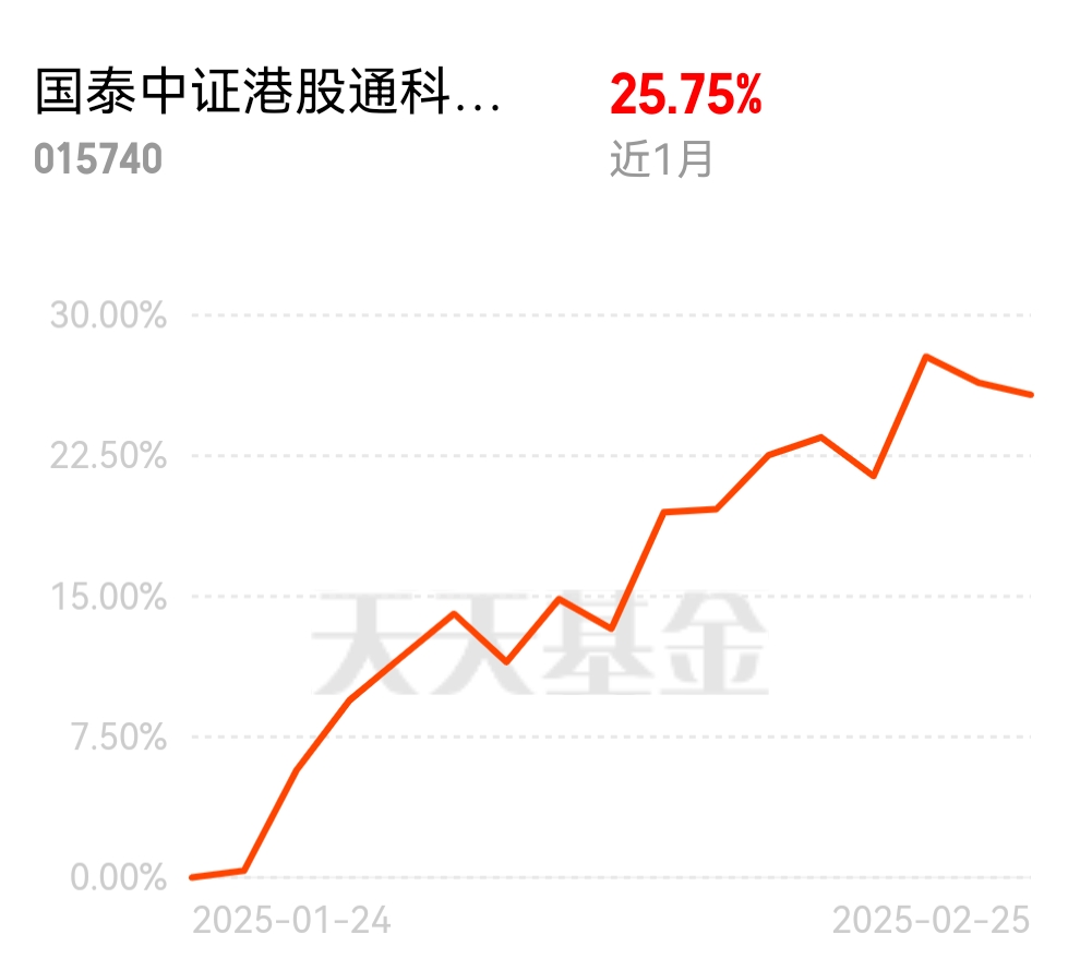 经过综合分析我认为国泰中证港股通科技是非常具有性价比的,很多QDII基金投港股会有额度限制,但是港股通产品不受影响~。从业绩上看,国泰港股科技C近一月涨幅接近三十个点,近半年涨幅接近八十个点,继续看好后续反弹,大幅跑赢了恒生科技指数,目前进攻性非常十足,今天再创三年历史新高,继续吃肉就行了,这个位置还会涨,目前南向资金每天都在大幅度加仓进场,后续我认为创历史新高也不是问题,这个位置回调就是倒车接人的机会,继续拿着吃肉,这个位置没有什么担忧的,每次回调就会反包,拿稳就行$国泰中证港股通科技ETF发起联接C$