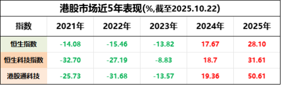 截止到2025年10月22日,港股市场主要指数近5年业绩变动如下:相较而言,港股通科技指数表现好一些。