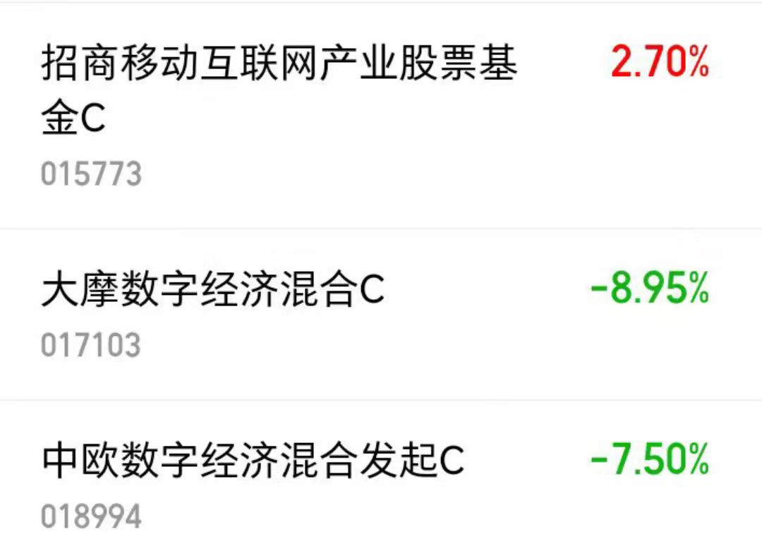 比如$招商移动互联网产业股票基金C(OTCFUND|015773)$近一个月涨幅还是保持在了2.7%$大摩数字经济混合C(OTCFUND|017103)$近一个月下跌8.95%