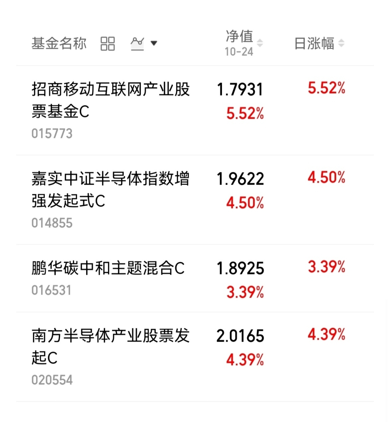 南方半导体产业股票发起C(OTCFUND|020554)上周五上涨了4.39%,嘉实中证半导体指数增强发起式C(OTCFUND|014855)同期涨幅达到4.5%。此外,鹏华碳中和主题混合C(OTCFUND|016531)也有3.39%的涨幅。