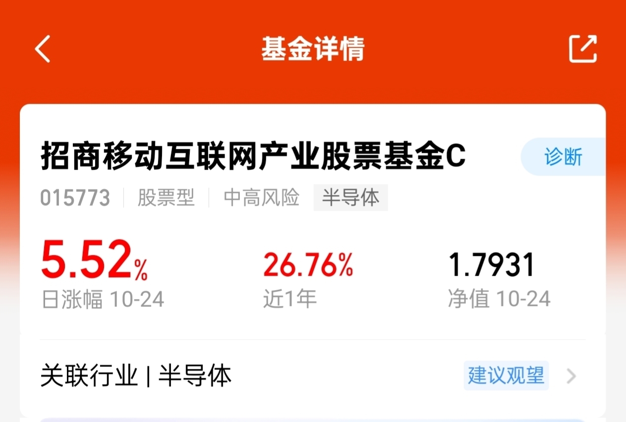 我注意到互联网板块中,招商移动互联网产业股票基金C(OTCFUND|015773)上周五以5.52%的涨幅领跑。