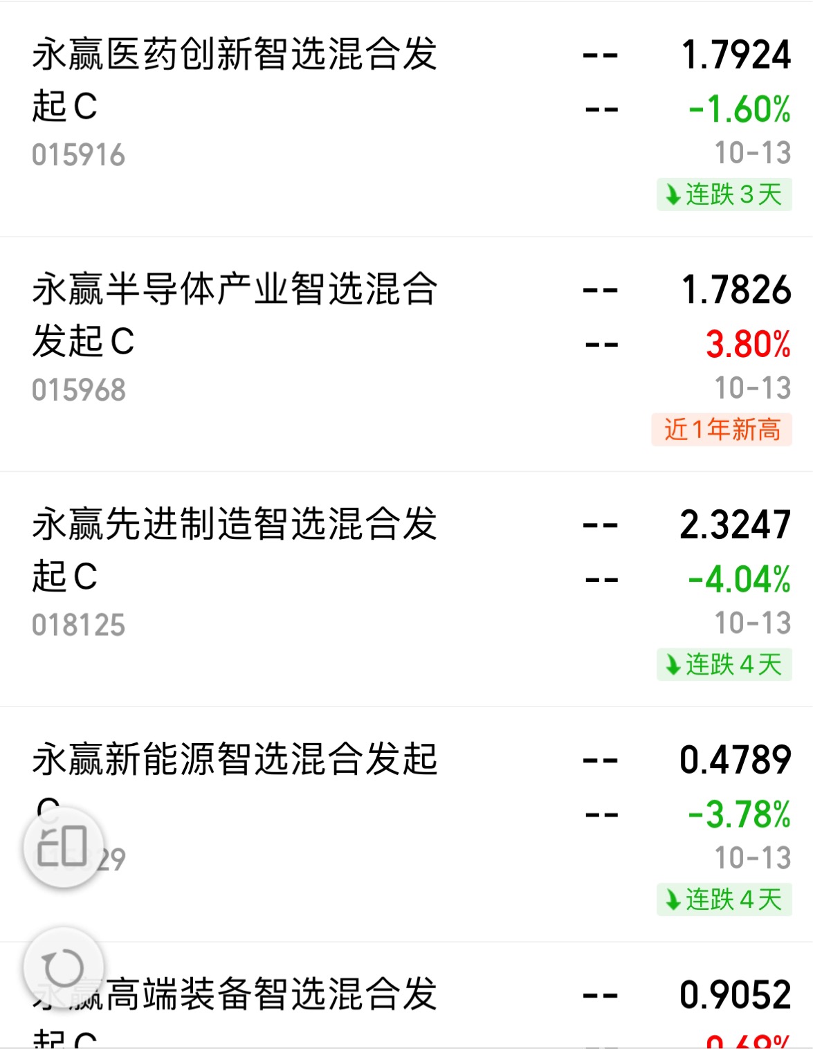 看看永赢家族今天整体走势:最近都是可以加仓起来了$永赢医药创新智选混合发起C$ 医药创新掉1.60%近3个月收11.38%表现优秀。$永赢新能源智选混合发起C$ 新能源掉3.78%%近3个月收41.48%表现不错。$永赢高端装备智选混合发起C$ 高端制造收0.69%近3个月收15.11%还有发展空间。从各个阶段来看这些还是比较给力的,产品有医疗创新,机器人,新能源,光刻机等等!希望后面走势更好哈!这些基本都是潜力股呀,可以加关注起来了!