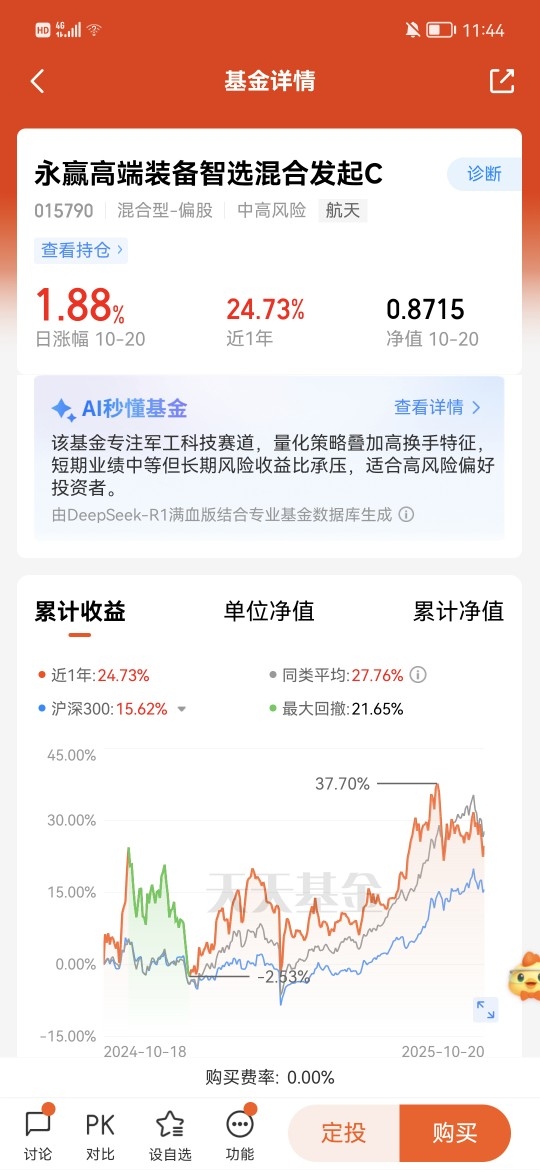 $永赢高端装备智选混合发起C$ 是卫星互联网主题基金,锁定卫星制造、发射服务、地面设备三大产业链环节,再通过财务健康度和研发投入占比精选优质标的,最终形成高度集中的持仓结构。昨天上涨1.88%,近六个月涨17.95%,近一年24.73%的涨幅,跑赢同期沪深300指数。当前板块估值仍处于历史低位,我已经提前布局好了,坐等吃肉行情到来。#10月基金投资策略#