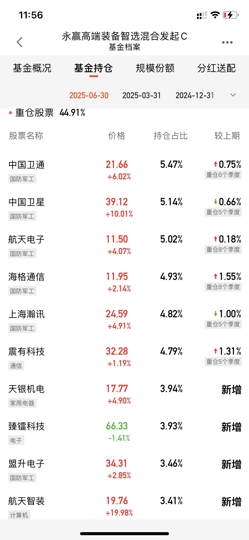 $永赢高端装备智选混合发起C$ 目前这持仓股几乎飘红啊,涨势不错嘛!永赢高端装备智选把握卫星发展大机遇,持仓纯粹,弹性也强,今天卫星互联网全面领涨超5%,强势反弹啊,卫星互联网概念股在市场上表现优秀,覆盖面广,抗干扰能力强,板块前景广阔,还是很值得期待的!#10月基金投资策略#