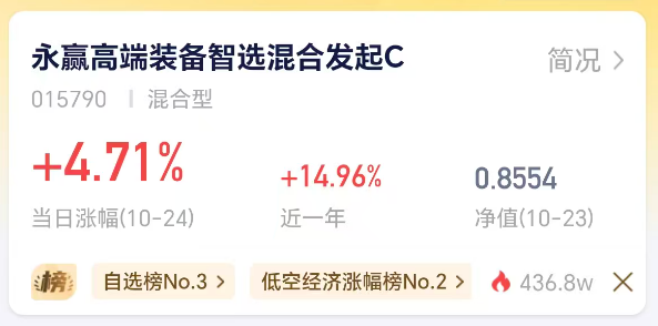 在永赢智选系列中,永赢高端装备智选混合发起C(015790)有着鲜明的“专精标签”——系列里的永赢先进制造聚焦机器人龙头、永赢数字经济深耕算力领域、永赢医药创新重仓港股创新药,每一只都精准卡位高成长赛道,而它则是全市场第一只专门瞄准商用航天与卫星通信领域的基金。更值得关注的是,它和永赢先进制造由同一位基金经理张璐管理,张璐在军工与高端装备赛道积累了深厚的投研经验,擅长挖掘产业链中的优质标的,这让产品具备了可观的弹性,不少交易日单日涨幅超过5%。业绩表现上,产品也展现出稳健优势:近三月上涨7.65%,近6月上涨14.22%,近1年上涨14.96%,在同类产品中处于前列,今天上涨超4%,同类涨幅第一。