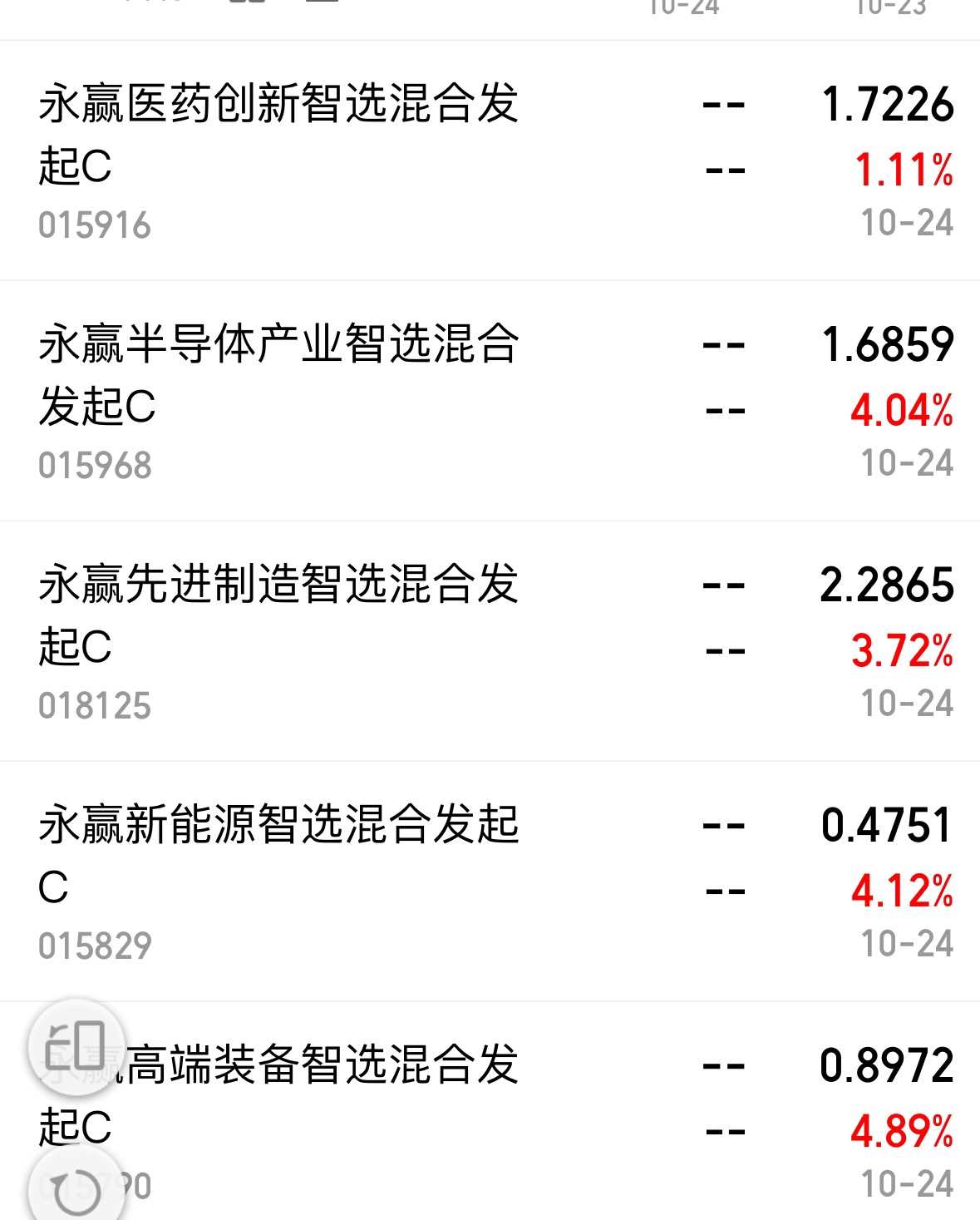 看看永赢家族今天整体走势:最近都是可以加仓起来了$永赢医药创新智选混合发起C$ 医药创新收1.11%,近6个月收30.06%表现优秀。$永赢新能源智选混合发起C$ 新能源收4.12%,近3个月收24.60%表现不错。$永赢高端装备智选混合发起C$ 高端制造收4.89%,近3个月收11.73%还有发展空间。从各个阶段来看这些还是比较给力的,产品有医疗创新,机器人,新能源,光刻机等等!希望后面走势更好哈!这些基本都是潜力股呀,可以加关注起来了!