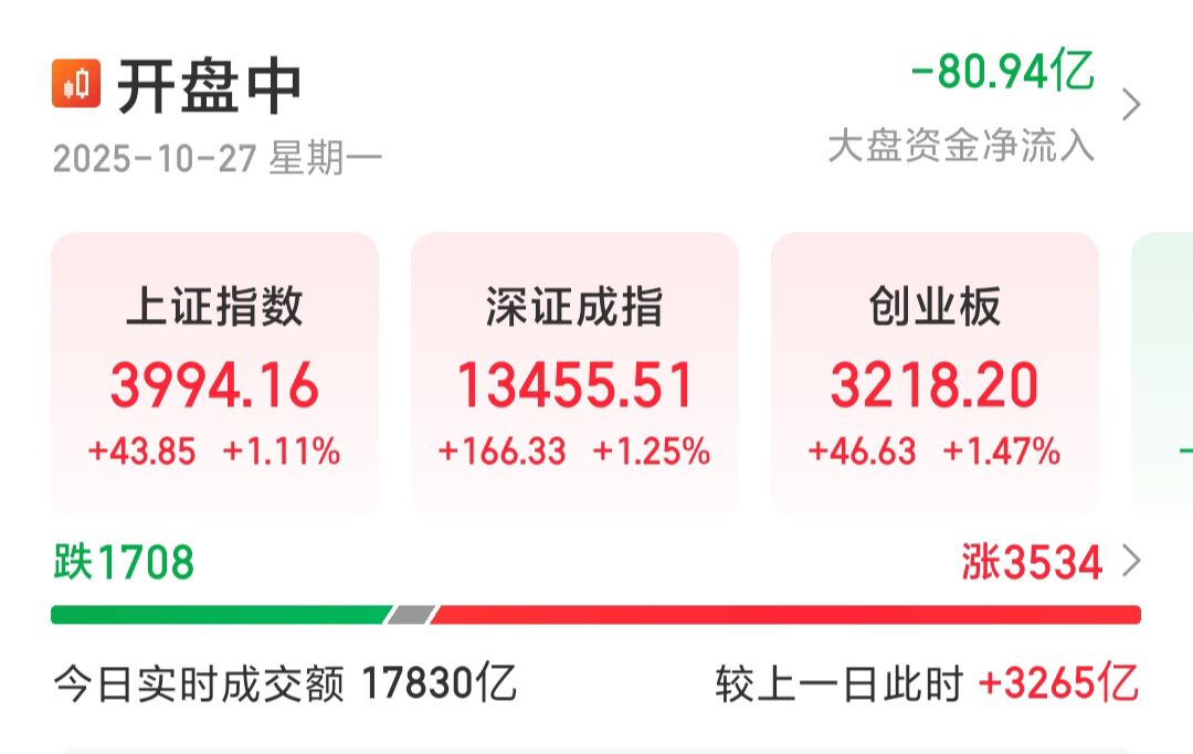 周末两个大国在马来西亚经贸磋商达成基本共识,这有助于减少因贸易摩擦导致的全球产业链、供应链断裂风险,为全球经济复苏减少不确定性,因此对股市也是一个很不错的利好,受此影响,A股全面高开,随后继续保持强势,尤其是上证指数最高涨至3995点,继续刷新10年新高,直逼4000点大关。