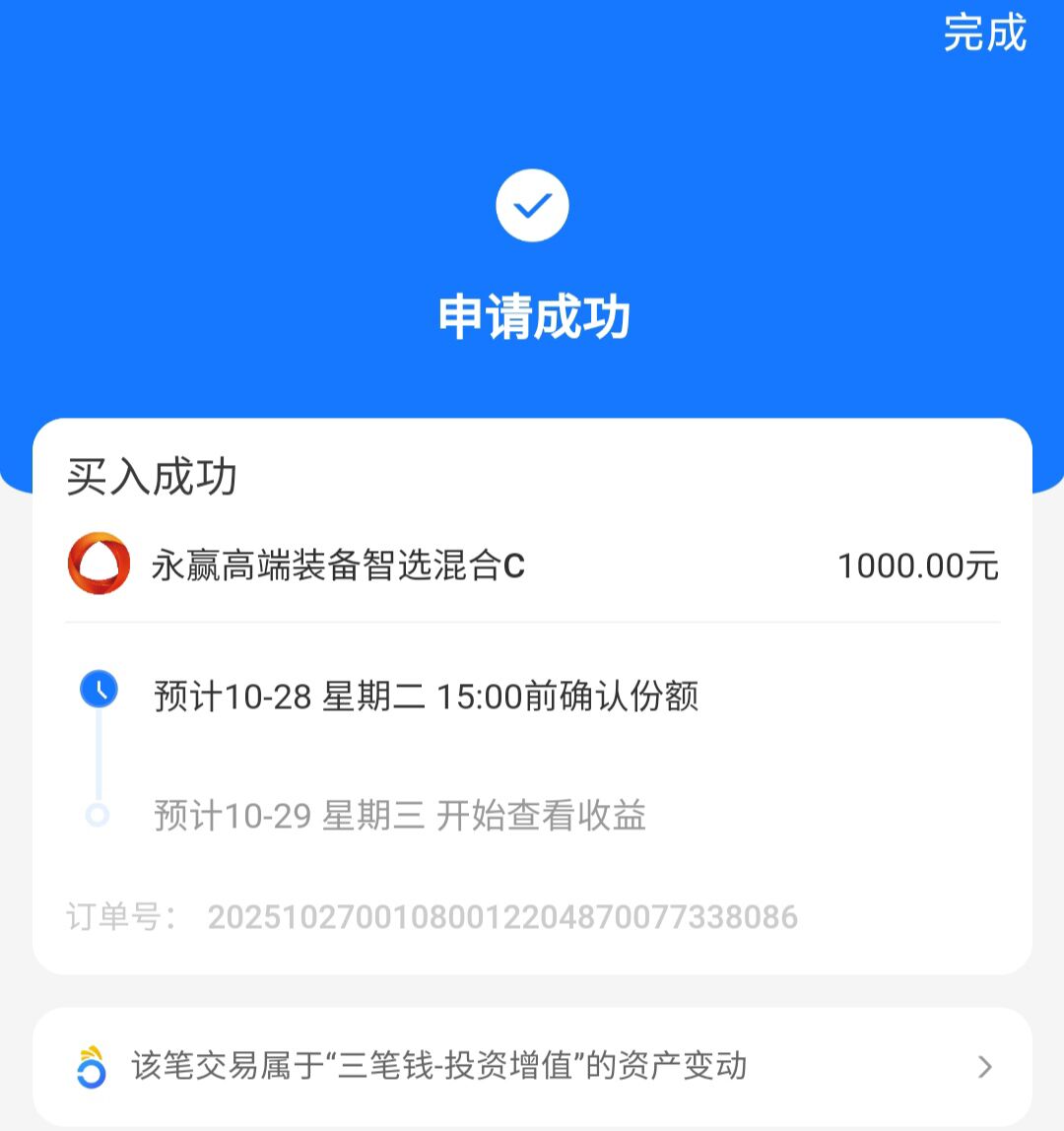 今日加仓$永赢高端装备智选混合发起C(OTCFUND|015790)$1000元,该基金聚焦卫星互联网,弹性比较大,由于十五五公布,提及航天强国,商业航天既承担重大工程配套任务,又通过技术创新及降低成本,推动卫星互联网等新兴领域的商业化进展,总之利好公布后引发卫星互联网大涨,上周五该基金大涨4.89%,远超我的预期,今天延续上攻态势,有望继续给我带来惊喜,我个人以为目前A股牛市继续,而十五五的公布将会加速卫星互联网的快速发展,因此这是一个很不错的赛道,我今天决定继续追加1000元增大仓位。