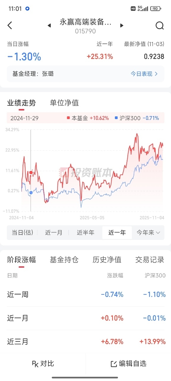 今天指数震荡,眼看还要继续整理,趁回调上车永赢高端装备015790,持仓纯粹弹性超高,近三个月涨幅12.23%,近六个月涨23.98%,这只基主投商业航天,卫星互联网等方向,十月表现不错,11月接着涨吧。