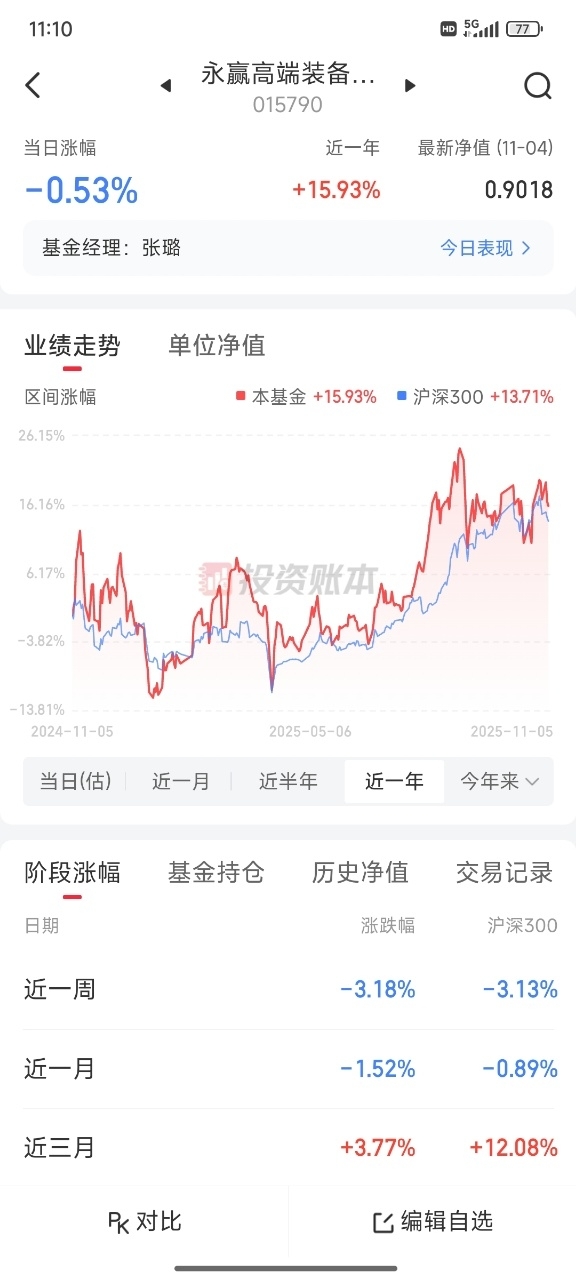 今天指数震荡,眼看还要继续整理,趁回调上车永赢高端装备015790,持仓纯粹弹性高,近三个月涨幅12.23%,近六个月涨23.98%,这只基主投商业航天,卫星互联网等方向,十月表现不错,11月接着涨吧。
