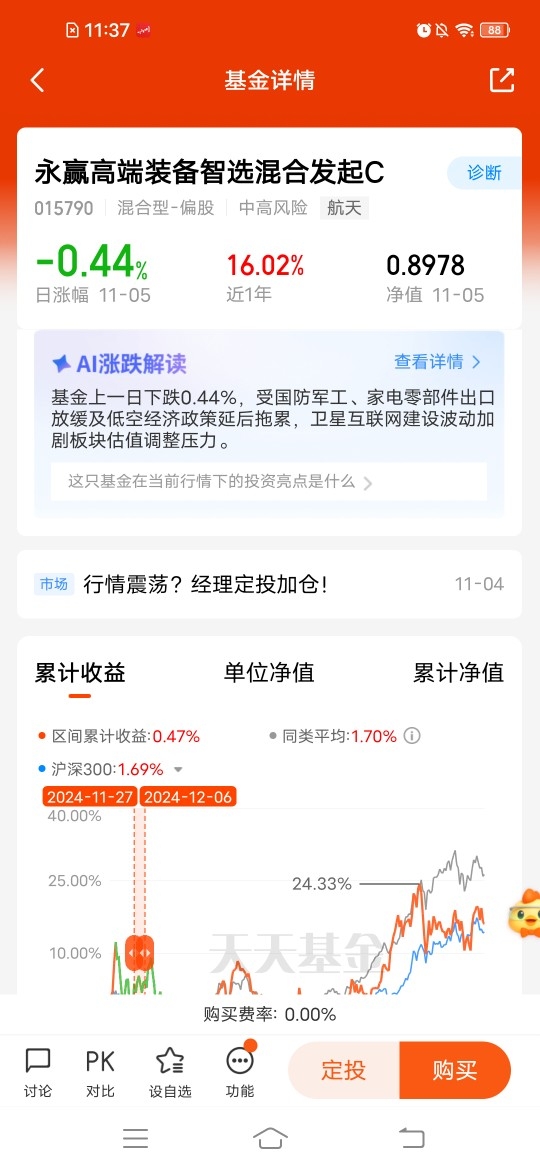 $永赢高端装备智选混合发起C$ 企稳反弹,是时候入场了,近三个月涨幅3.86%,近六个月涨幅20.49%,这个主投卫星互联网,卫星互联网,目前估值低布局更有性比价,不能错过这波时机,主动型基金具有较低的费用比率,一般流动性较好,持仓都是高科技赛道,更值得期待。#英伟达市值突破5万亿美元!啥信号?#