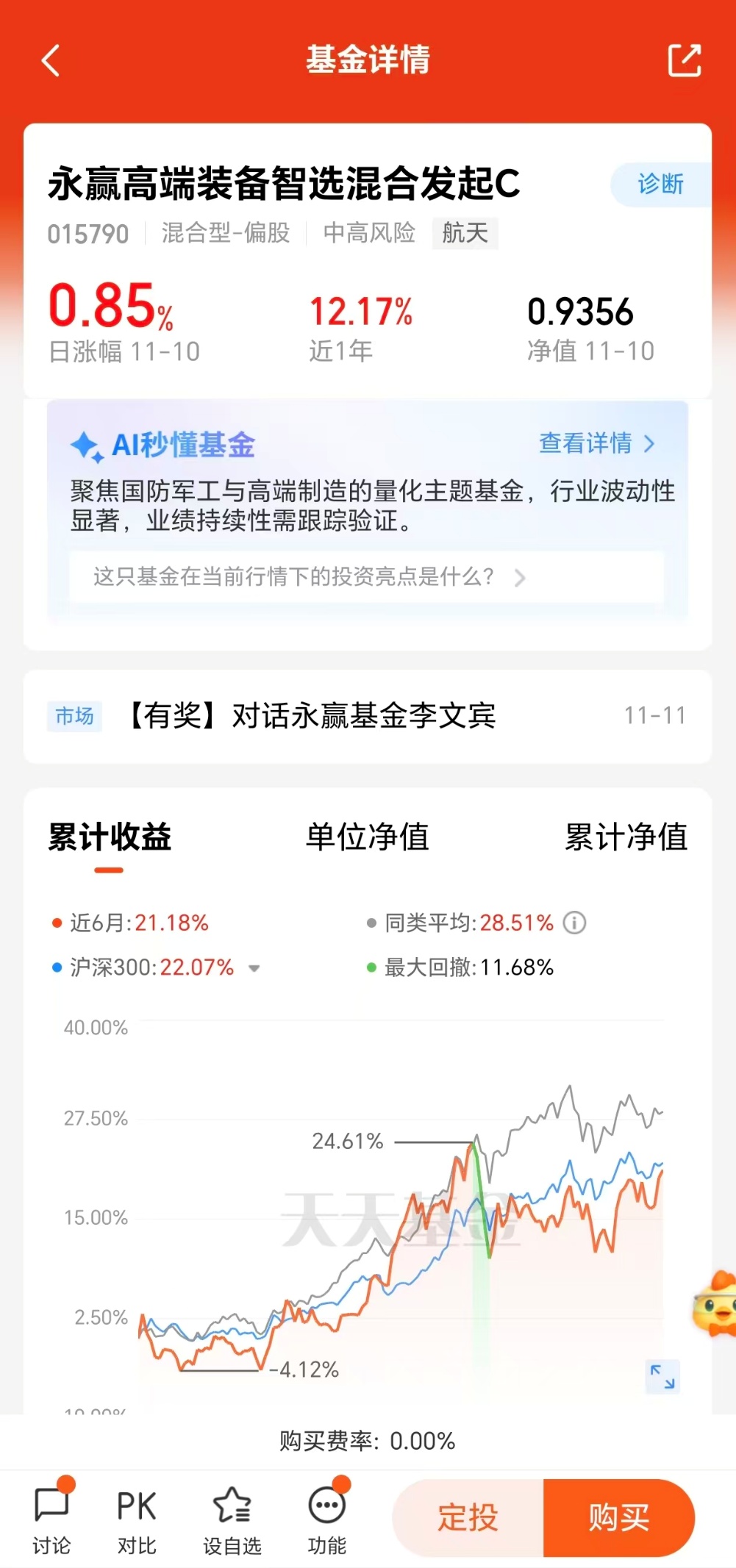 航空航天板块的整体走强也为卫星互联网赛道提供了有力支撑。11月以来,航空航天板块指数稳步攀升,11月6日单日涨幅达1.24%,产业景气度持续提升。随着“航天强国”建设进入落地阶段,加上卫星互联网与6G、物联网的深度融合,万亿级市场空间正在逐步打开。对于普通投资者而言,永赢高端装备智选混合发起C(015790)凭借其独特的赛道聚焦优势和亮眼的业绩表现,成为了分享卫星互联网产业成长红利的理想选择,在行业持续高景气的背景下,其未来表现值得期待。#“马”字辈再度活跃!如何看待“炒生肖”?#